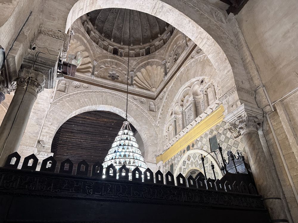 أما المنبر الخشبي، فهو تحفة فنية نادرة، يعود إلى العصر الفاطمي، محفور بدقة ومزين بزخارف هندسية متقنة، ويعدّ من أقدم المنابر في العالم الإسلامي. وبجانب المنبر، تتلألأ المحراب بنقوشه الفريدة التي تحكي قرونًا من الإبداع المعماري الإسلامي.