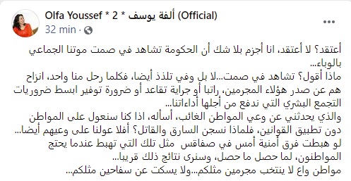 انتقدت الكاتبة والجامعية، ألفة يوسف، تعاطي الحكومة مع الوضع الوبائي، في ظل الارتفاع المتواصل لعدد الوفيات والإصابات بفيروس كورونا.