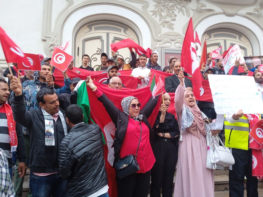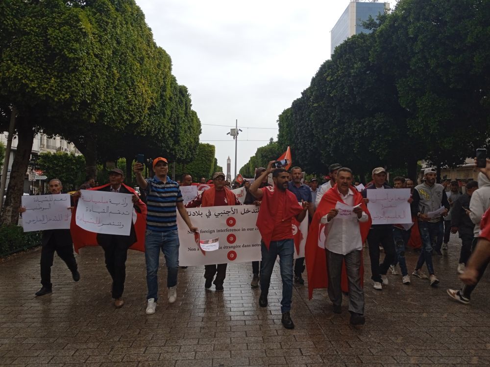 وتوجه المشاركون في المسيرة بعد تنفيذ وقفة المساندة ، باتجاه مقر السفارة الفرنسية بشارع الحبيب بورقيبة حاملين علما وطنيا كبير الحجم ومرددين هتافات تدعوا لعدم التدخل الاجنبي في القرار السيادي الوطني ، ورافعين شعارات على غرار "بالروح بالدم نفديك يا علم "و"تونس حرة حرة والعميل على برة "