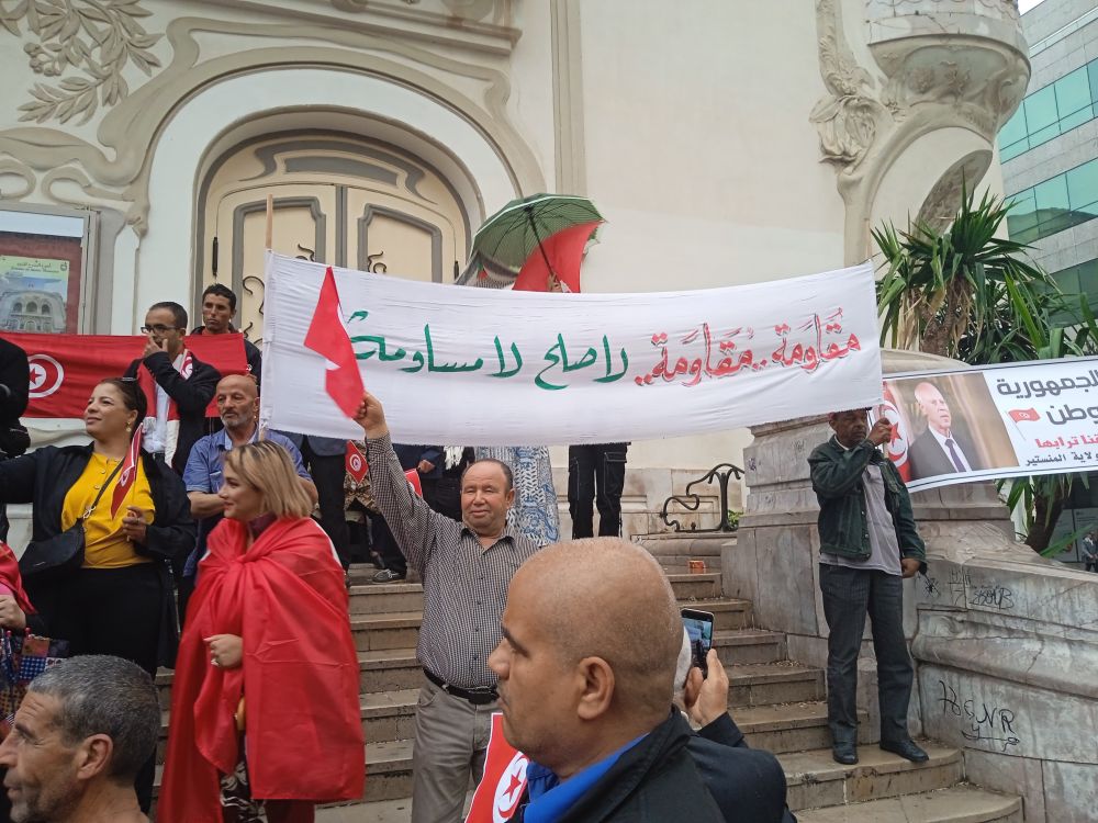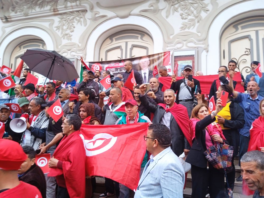 تجمع عدد من أنصار رئيس الجمهورية قيس سعيّد أمام المسرح البلدي بالعاصمة ، للتنديد بالتدخل الأجنبي في الشؤون الداخلية لتونس.