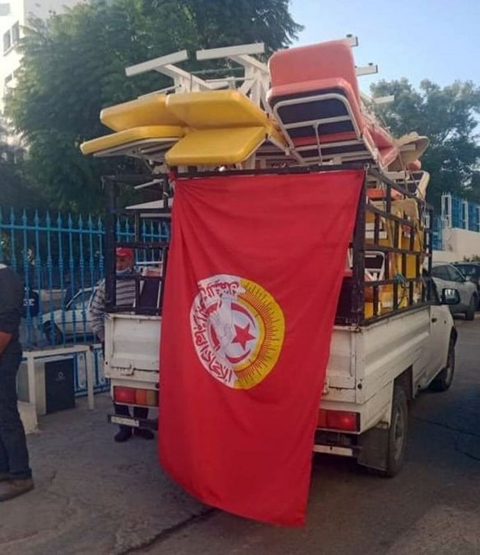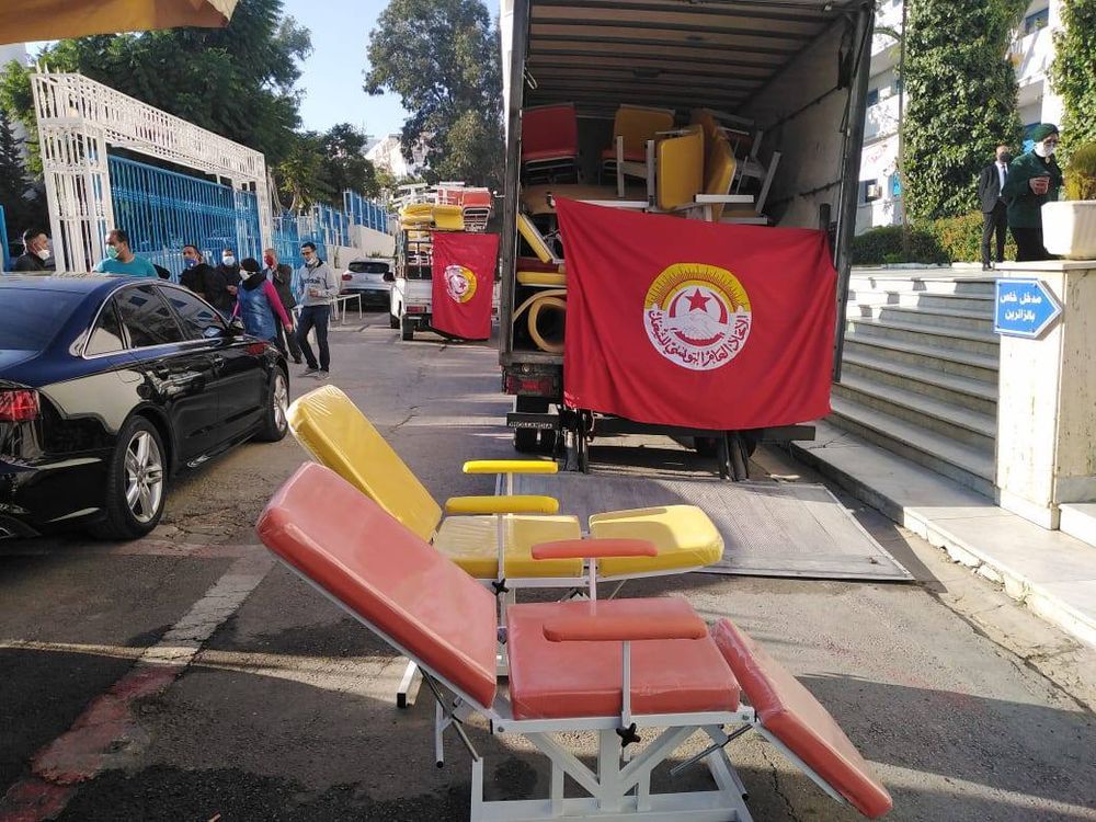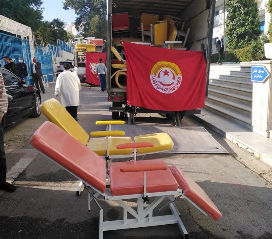 سلّم اتّحاد الشّغل اليوم الثلاثاء هبة لوزارة الصحة تتمثّل في تجهيزات طبيّة (كراسي طبيّة) سيتمّ توزيعها على أقسام الاستعجالي بمستشفيات الرابطة وشارل نيكول وعبدالرحمان مامي والمستشفى الجهوي ببن عروس بحضور كل من وزير الصحة و الأمين العام لإتحاد الشغل.