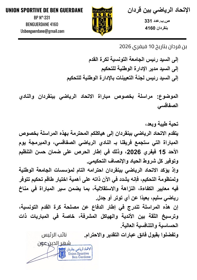 وجّه الإتحاد الرياضي ببن قردان مراسلة اليوم الثلاثاء إلى الجامعة التونسية لكرة القدم و الإدارة الوطنية للتحكيم من أجل ضمان حسن التنظيم و توفير كل شروط الحياد والإنصاف التحكيمي قبل مواجهة النادي الصفاقسي الأحد القادم في إطار الجولة السادسة إياب للبطولة.
