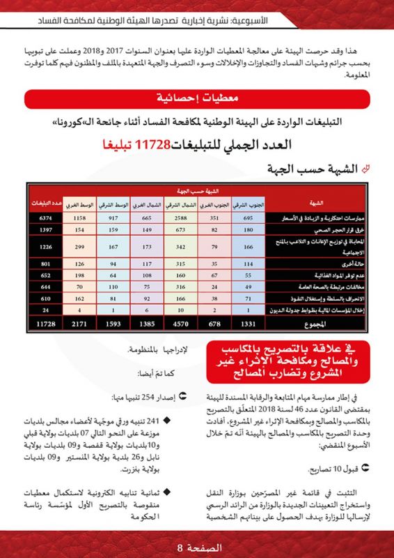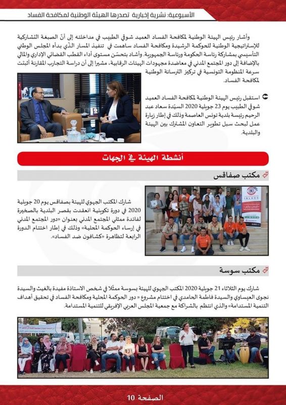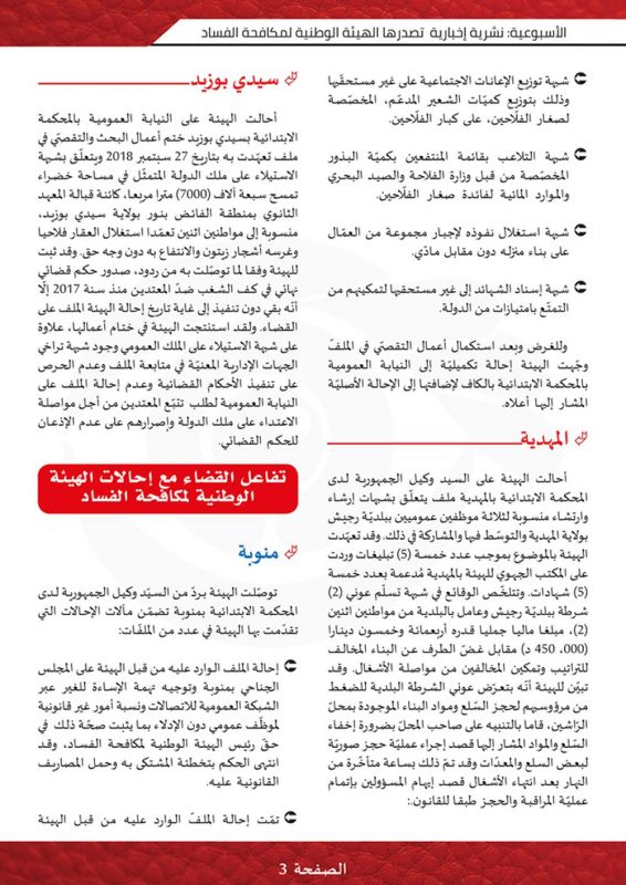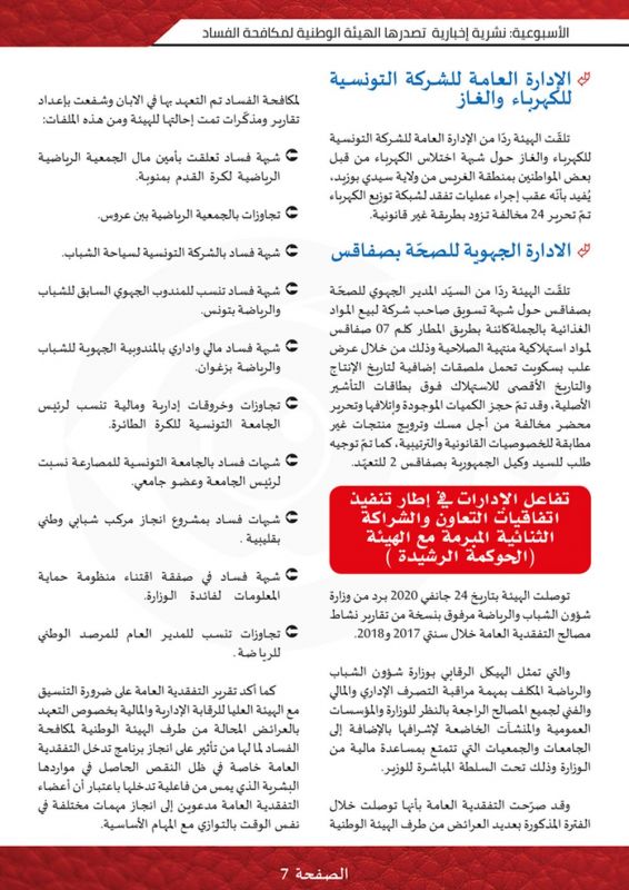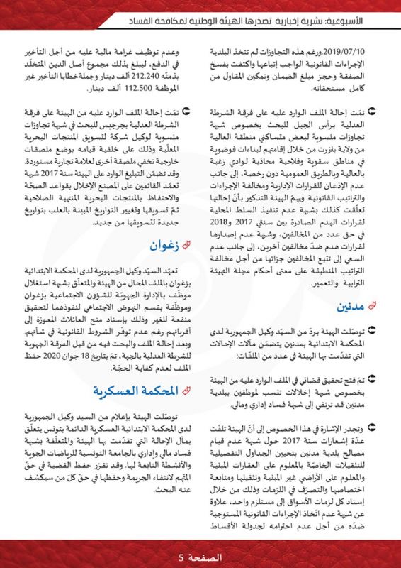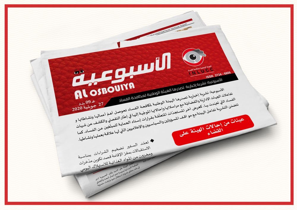 نشرت الهيئة الوطنيّة لمكافحة الفساد أمس نشرة إخبارية أسبوعية تحوصل أهمّ أعمالها ونشاطاتها وأهمّ تفاعلات الجهات الإداريّة والقضائيّة مع مراسلاتها وإحالاتها الموجّهة إليها في إطار التقصّي والكشف عن شبهات الفساد التّي تعهّدت بها، كآخر المستجدّات المتعلّقة بقرارات إسناد الحماية للمبلّغين عن الفساد.
