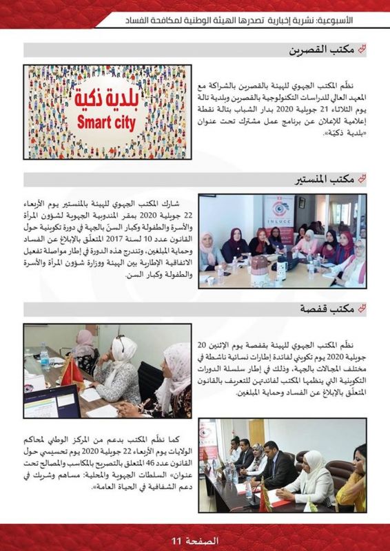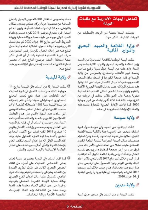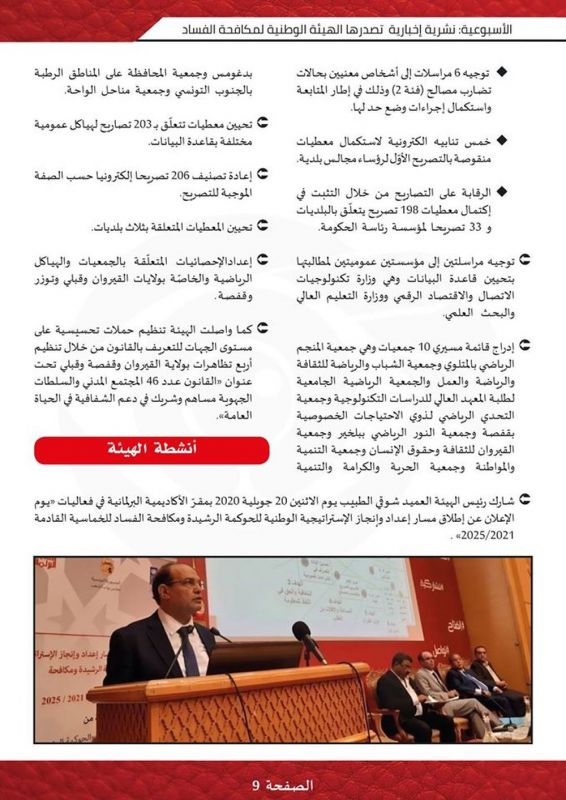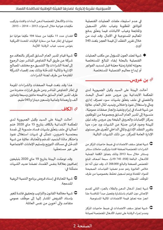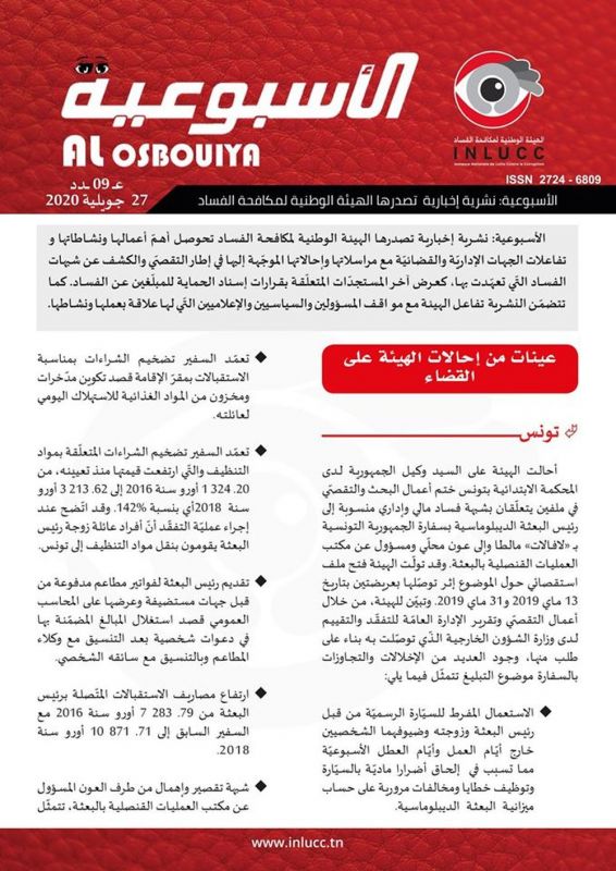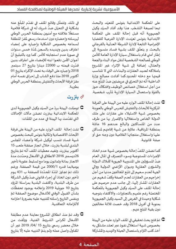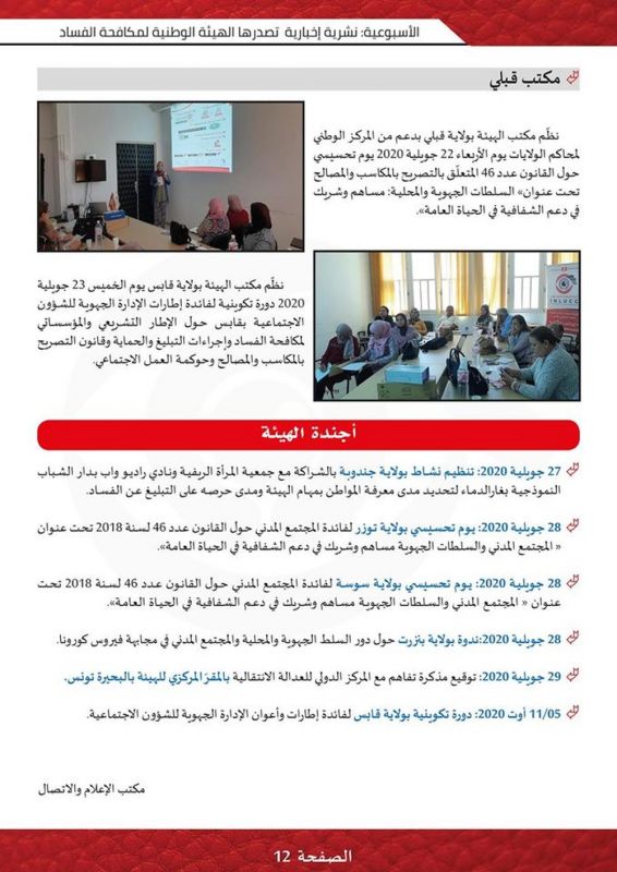 نشرت الهيئة الوطنيّة لمكافحة الفساد أمس نشرة إخبارية أسبوعية تحوصل أهمّ أعمالها ونشاطاتها وأهمّ تفاعلات الجهات الإداريّة والقضائيّة مع مراسلاتها وإحالاتها الموجّهة إليها في إطار التقصّي والكشف عن شبهات الفساد التّي تعهّدت بها، كآخر المستجدّات المتعلّقة بقرارات إسناد الحماية للمبلّغين عن الفساد.