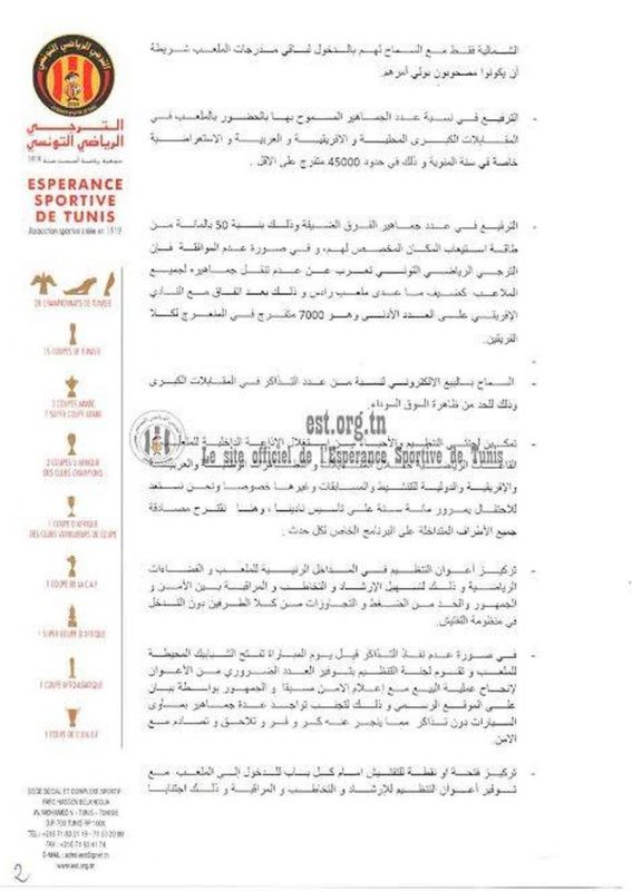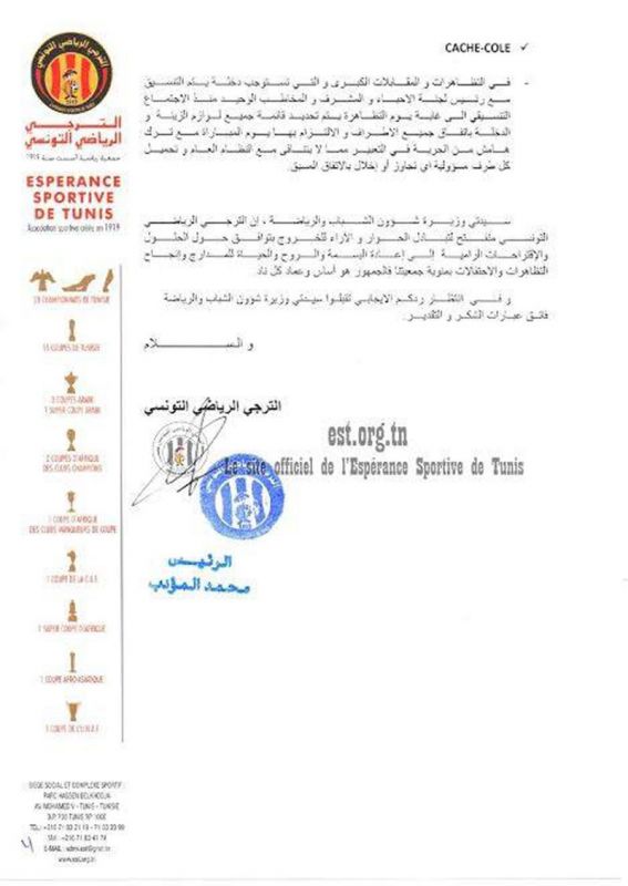 وجهت الهيئة المديرة للترجي الرياضي التونسي إلى وزيرة شؤون الشباب والرياضة مراسلة ممضاة من قبل رئيس النادي حمدي المدب وذلك في إطار سعيها إلى توفير المناخ الملائم والظروف الطيبة لحضور جماهيرها لمقابلات الفريق في أفضل الظروف دون أي عراقيل وكذلك إلى القضاء على غول العنف الذي ينخر الرياضة التونسية وفق ما جاء في بلاغ النادي.