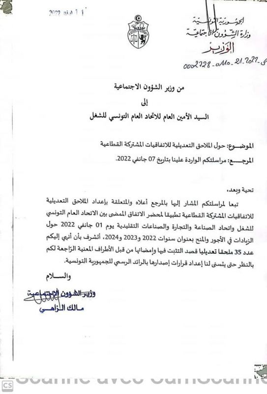 أعلن الاتحاد العام التونسي للشغل، اليوم الجمعة، عن إمضاء الملاحق التعديلية للزيادة في أجور القطاع الخاص.