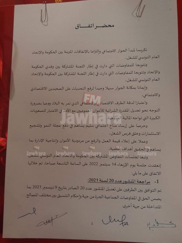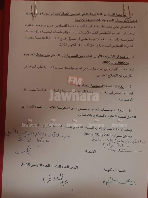 على تعديل المنشور عدد 20 الصادر بتاريخ 9 ديسمبر 2021 بما يضمن الحق في المفاوضات الجماعية الحرّة من جهة وإحكام التنسيق بين مختلف المصالح المتداخلة من جهة أخرى، إضافة إلى عقـد جلسـة ختاميـة للجنة الفنية للتفاوض حـول مراجعـة الـقـانـون المتعلـق بالنظـام الأساسـي الـعـام لأعـوان الدولـة والجماعـات المحليـة والمؤسسـات العموميـة ذات الصبغة الإداريـة علـى أن تـتـولى رفـع النقـاط الخلافيـة للجنـة المشتركة للتفاوض للبتّ فيها في أجل أقصاه 31 أكتوبر 2022.