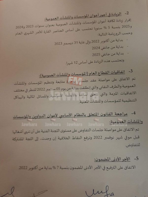 ويقضي الاتفاق بالزيادة في أجور أعوان المؤسسات والمنشآت العمومية و إقرار زيادة لكافة أعوان المؤسسات والمنشآت العمومية بعنوان سنوات 2023 و2024 و2025 بنسبة 5 % سنويا تُحتسب على أساس العناصر القارة للأجر الشهري و ستكون هذه الزيادة حسب الأمين العام لاتحاد الشغل نور الدين الطبوبي على مراحل، المرحلة الأولى بداية من أكتوبر 2022 وإلى غاية 31 ديسمبر 2023 و المرحلة الثانية بداية من جانفي 2024، أمّا المرحلة الثالثة فهي بداية من جانفي 2025 وتُحتسب هذه الزيادة على أساس 12 شهرا.