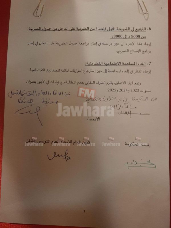 وقّع الاتحاد العام التونسي للشغل والحكومة، مساء اليوم الخميس، بقصر الحكومة بالقصبة، على اتفاق يقضي بالزيادة في الاجور في الوظيفة العمومية والقطاع العام وكذلك الزيادة في الاجر الادنى المضمون.