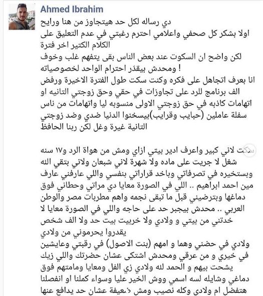 وتحدث ابراهيم مطولا عن علاقته المتميزة بزوجته الأولى التي قال أنها لاتزال على ذمته وبأبنائه مؤكدا أن خيّر في البداية عدم الرد على السخرية والنقد الذي طاله بسبب زواجه من أنغام التي تكبره بـ11 عاما مؤكدا أن "ابن بورسعيد" وأنه قادر على رد على منتقديه لفظيا أو بالتأديب "ضربا بالجزمة " إن لزم الأمر.