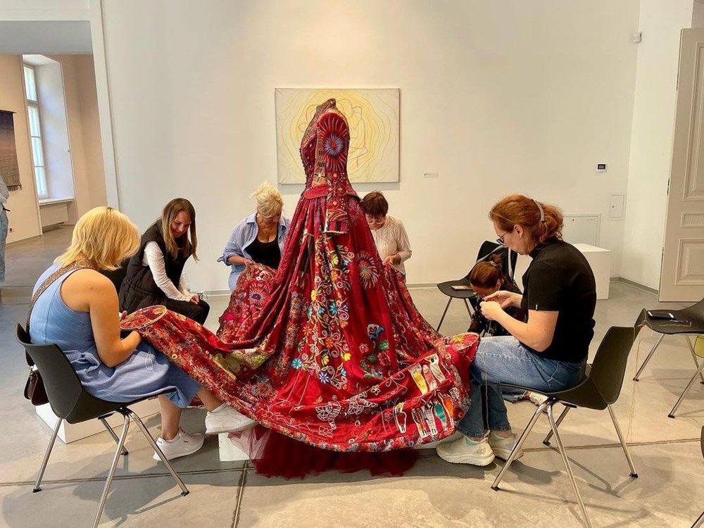 صُنع الثوب الأحمر المميز من 84 قطعة حرير باللون الأحمر الغامق، الذي يعبر عن الغضب والثورة والحب والشغف، وشارك فيه 136 عاملاً بمقابل مادي، بينما أضيفت بقية التطريزات من قبل الجمهور المشارك في المعارض والفعاليات. وشمل الجمهور المشارك في تطريز الفستان الأحمر، نساء من جميع أنحاء العالم، منهن لاجئات من فلسطين وسوريا وأوكرانيا، وطالبات لجوء في المملكة المتحدة من العراق والصين ونيجيريا وناميبيا، وضحايا الحرب في كوسوفو، ورواندا، وجمهورية الكونغو الديمقراطية.