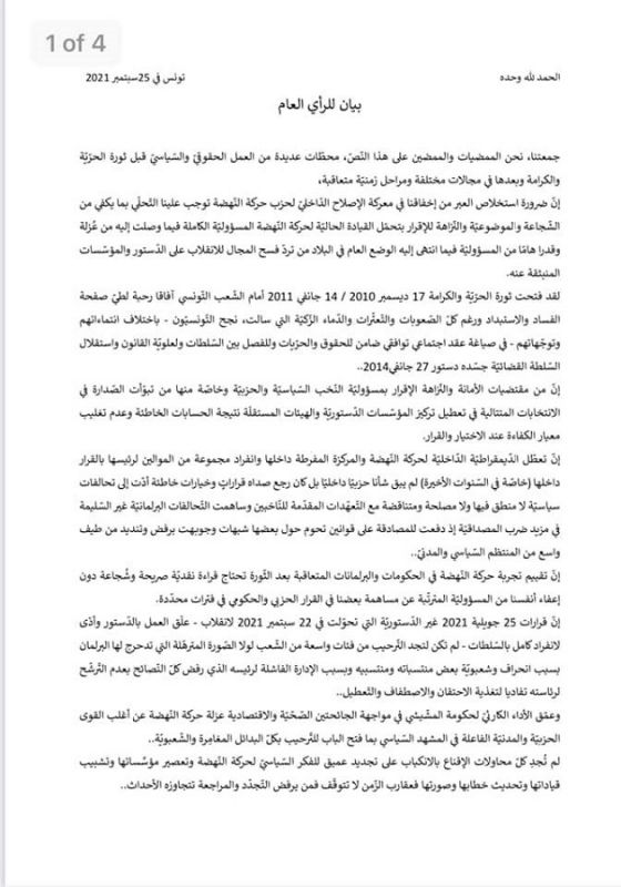 وأرجع المستقيلون في بيان مشترك، قرارهم "لتعطل الديمقراطية الداخلية صلب الحركة وانفراد مجموعة من الموالين لرئيسها بالقرار داخلها، ما انجر عنه قرارات و خيارات خاطئة أدت إلى تحالفات سياسية لا منطق فيها ولا مصلحة ومتناقضة مع التعهدات المقدمة للناخبين، إضافة إلى مساهمة التحالفات البرلمانية الغير سليمة في مزيد ضرب المصداقية"، حسب نصّ البيان.