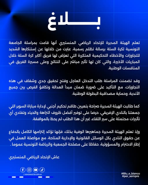 وجهت هئية الاتحاد المنستيري رسالة تظلم الى الجامعة التونسية لكرة السلة عبرت من خلالها عن إستنكارها الشديد للتجاوزات والأخطاء التحكيمية المتكررة التي تعرض لها فريق كرة السلة خلال المباريات الأخيرة .