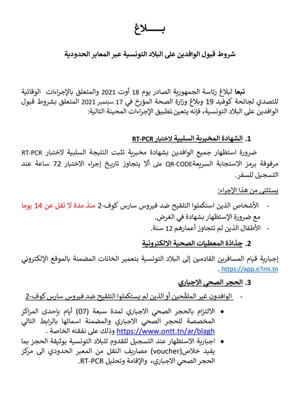 نشرت وزارة الصحّة اليوم الإجراءات الوقائيّة المحيّنة لقبول الوافدين على تونس وذلك بعد اجتماع تنسيقي جمع أعضاء اللجنة العلمية لمجابهة انتشار فيروس كورونا بفريق قاعة العمليات لإدارة جائحة كوفيد 19 حول شروط قبول الوافدين على البلاد التّونسيّة عبر المعابر الحدوديّة.