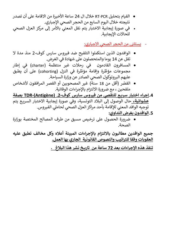 الإجراءات الوقائيّة المحيّنة لقبول الوافدين على تونس