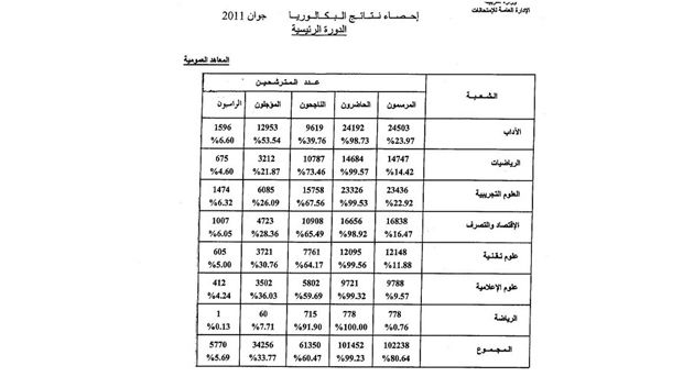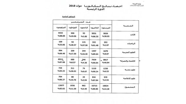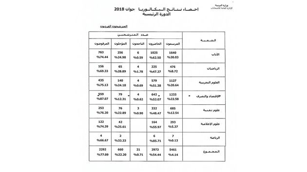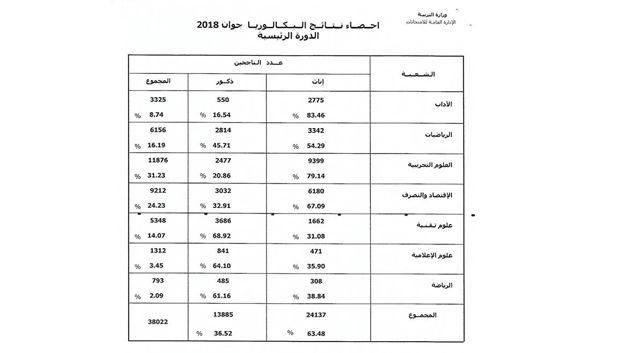 أعلنت وزارة التربية، أن عدد الناجحين في الدورة الرئيسية لامتحان الباكالوريا بلغ 38022 تلميذا، من بينهم 24137 إناث بنسبة 63.48 بالمائة و13885 ذكور بنسبة 36.52 بالمائة.
