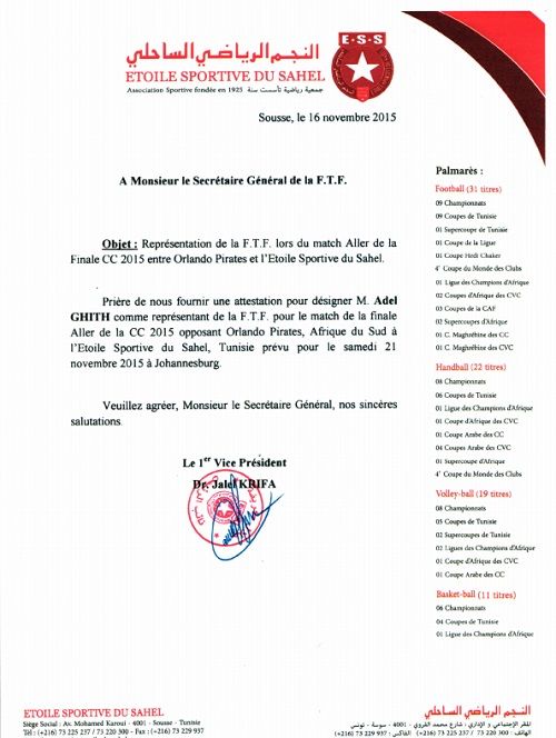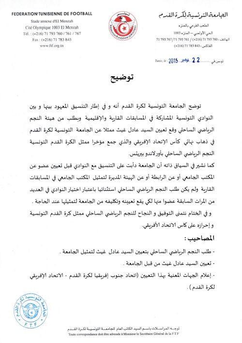 أوضحت الجامعة التونسية لكرة القدم في بيان توضيحي أصدرته اليوم أنها كانت قد عينت السيد عادل غيث الذي يشغل خطة كاتب عام صلب هيئة النجم الساحلي ليكون ممثلا للجامعة في ذهاب نهائي كأس الإتحاد الإفريقي التي جمعت النجم الساحلي بأورلاندو بيراتس الجنوب إفريقي.