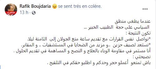 وقال بوجدارية: "عندما يطغى منطق السياسي على حجة الطبيب الخبير تكون النتيجة المزيد من الضحايا في المستشفيات والمقابر..نصيحتي باش تمنعو أعملو حجر وحدكم و اطلبو حقكم في التلقيح".