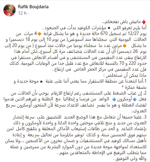 وأضاف في تدوينة نشرها على صفحته بالفايسبوك أن " غياب الضغط على المستشفى رغم ارتفاع الارقام يوحي بأن الحالات من فعل "أوميكرون" الوافد من فرنسا و إيطاليا مع الطلبة و غيرهم الذين قدموا لقضاء العطلة و هو ما يفسر تضاعف الاعداد بسرعة لأن المتحور أوميكرون سريع العدوى".