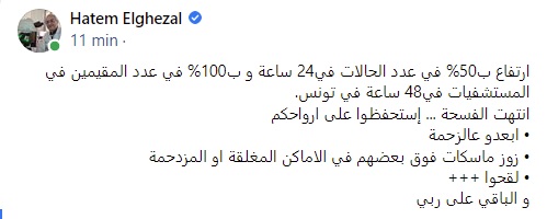 قال الدكتور حاتم الغزال، المختص في علم الأجنة، إنه قد تم تسجيل "ارتفاع ب50% في عدد الحالات في 24 ساعة و بـ100% في عدد المقيمين في المستشفيات في 48 ساعة في تونس جراء فيروس كورونا".