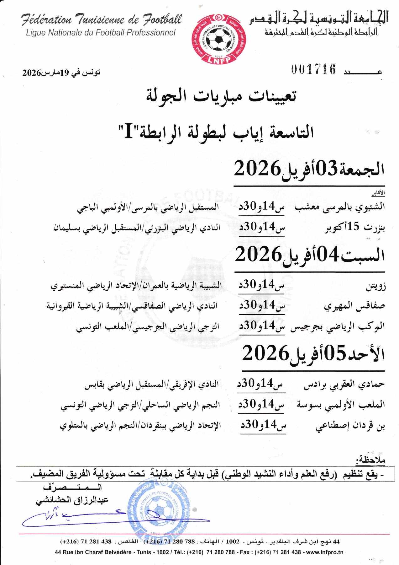 تدور مباريات الجولة التاسعة اياب من بطولة الرابطة المحترفة الأولى أيام 03 و 04 و 05 أفريل المقبل وفق البرنامج التالي:
