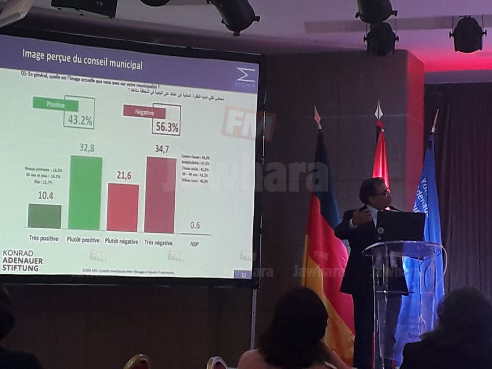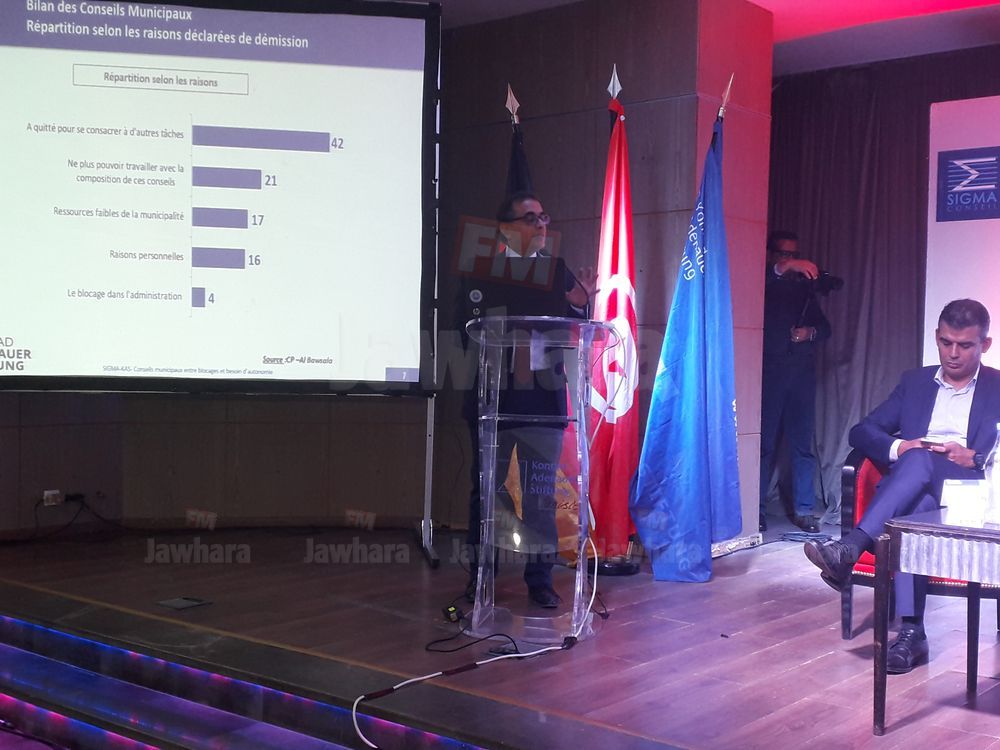 وفي سياق متصل أفاد الزرقوني أن قرابة ثلثي التونسيين غير راضين عن أداء المجالس البلدية المنبثقة عن انتخابات ماي 2018"، وفق استطلاع رأي أنجز بالشراكة بين "مؤسسة سيغما كوساي" و"مؤسسة كونراد اديناور شتيفتونغ" الألمانية.
