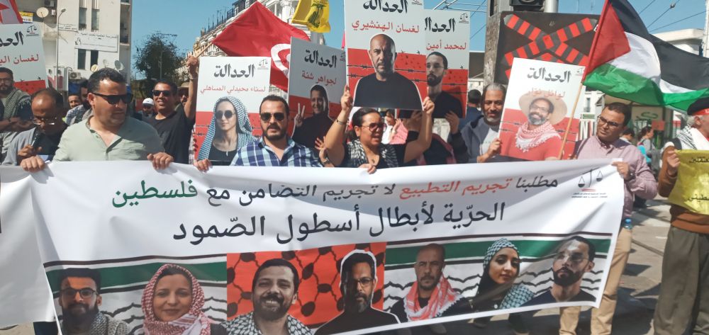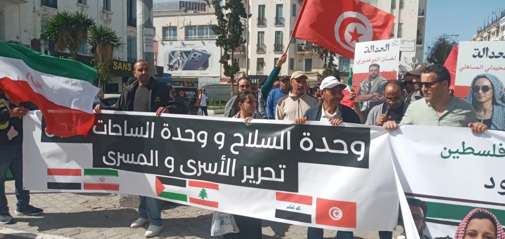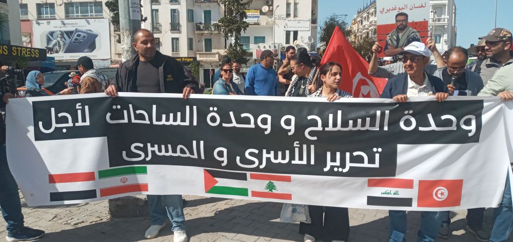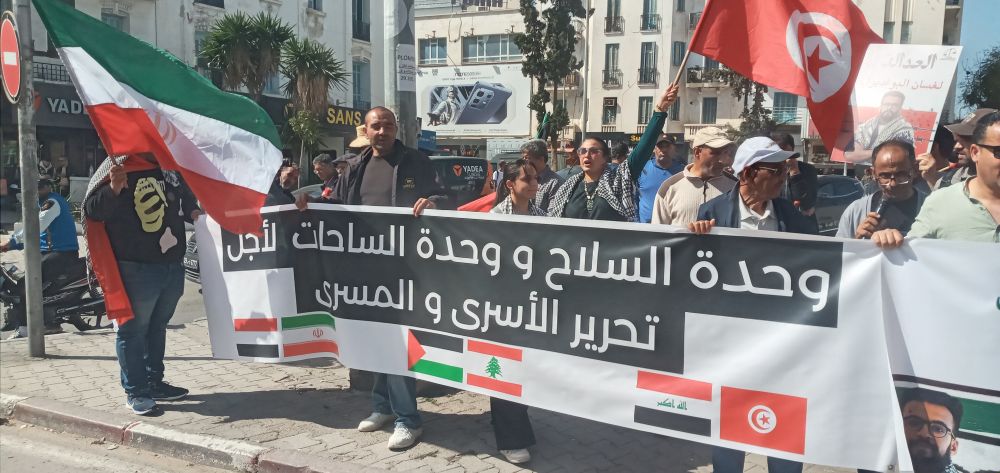 شهدت العاصمة التونسية، اليوم السبت، مسيرة احتجاجية، انطلقت من ساحة الجمهورية إلى المسرح البلدي، ورفع خلالها المشاركون شعارات تندد بالعدوان الصهيو-أمريكي وقانون إعدام الأسرى، كما رفعوا شعارات داعمة لجبهات المقاومة، وفق ما أكّده صلاح الدين المصري، عضو الشبكة التونسية للتصدي لمنظومة التطبيع.