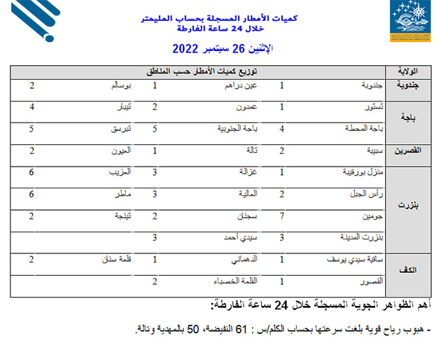 القائمة النهائية لكميات الأمطار و أهم الظواهر الجوية المسجلة خلال ال24 ساعة الفارطة..