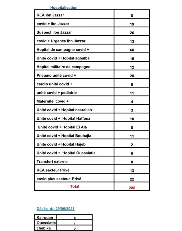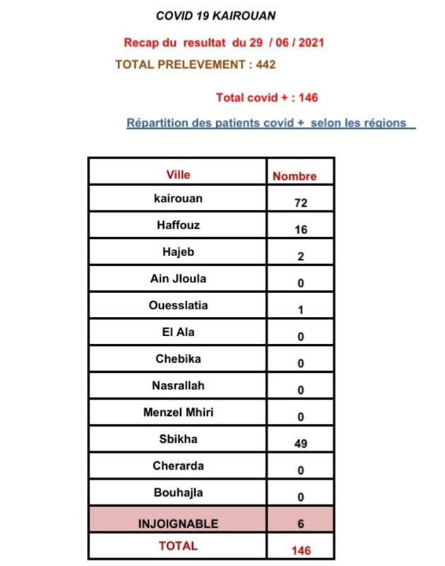 أعلنت الإدارة الجهوية للصحة بالقيروان عن تسجيل 9 وفيات و146 إصابة جديدة بفيروس كورونا بتاريخ 29 جوان الحالي، وذلك بعد رفع 442 عينة.