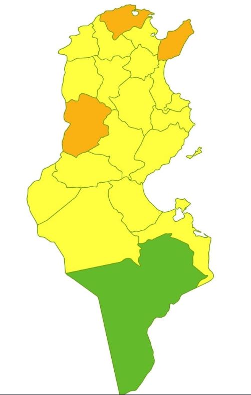 بالنسبة لولايات باللون الأصفر، فقد دعا المعهد الوطني للرصد الجوي للحذر أثناء ممارسة الأنشطة اليومية. أما بتطاوين التي تحمل اللون الأخضر، الوضع الجوي مستقر.
