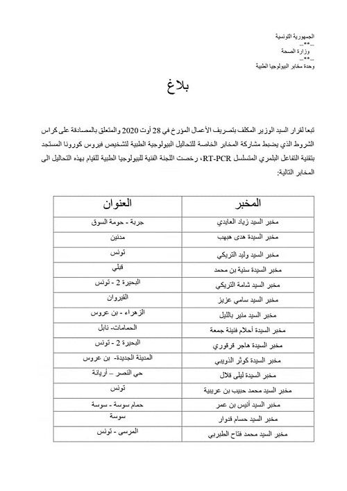 رخصت اللجنة الفنية للبيولوجيا الطبية لعدد من المخابر للقيام بتحاليل تشخيص فيروس كورونا المستجد بتقنية التفاعل البلمري المتسلسل.