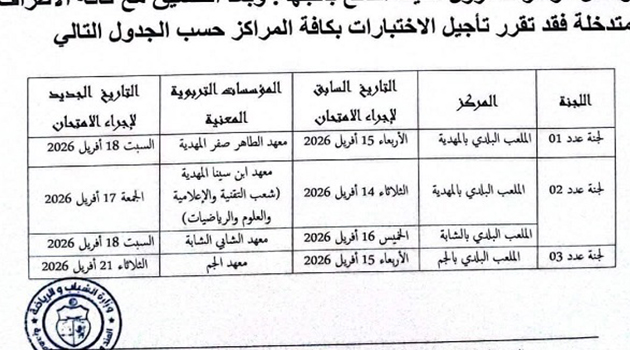 الاستقبال >أخبار >وطنية وطنية2026/04/14 19:56 Tweeter المهدية.. تأجيل الباك سبور والاعلان عن مواعيد جديدة أعلنت المندوبية الجهوية للشباب والرياضة بالمهدية في بلاغ اليوم أنه، تبعا لسوء الأحوال الجوية فقد تقرر تأجيل الاختبارات الرياضية للبكالوريا "باك سبور" وضبط روزمانة جديدة حسب الجدول التالي: مقالات أخرى دولية14/04/2026 واشنطن تستضيف اليوم محادثات مباشرة بين لبنان وإسرائيل وطنية14/04/2026 رئيس الدّولة: 'لابد من إجراء العديد من المراجعات' دولية14/04/2026 كوريا الشمالية تختبر صواريخ كروز ومضادة للسفن من على مدمرة بحرية فيديو14/04/2026 باحث في الجماعات الإسلاميّة: 'العديد من العيون تترصّد الجزائر' رياضة 14/04/2026 سوسة: تأجيل اختبارات 'الباك سبور' لهذا اليوم مجتمع14/04/2026 المهدية: تعليق للدروس بعدد من المعتمديات اليوم