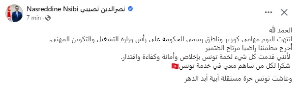 قال وزير التشغيل والتكوين المهني المُقال، نصر الدين النصيبي، إن "مهامه قد انتهت اليوم كوزير وناطق رسمي للحكومة".