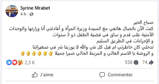 قالت النائب بالبرلمان، سيرين مرابط، في تدوينة نشرتها اليوم الخميس على صفحتها الرسمية بالفيسبوك، إنّ "وزيرة الأسرة والمرأة والطفولة وكبار السن أكّدت لها في اتّصال هاتفي أنّ الوزارة والوحدات الأمنية تعمل على قدمٍ وساقٍ بخصوص قضيّة طفل الـ3 سنوات بعد تلقّيها إشعاراً بشبهة تعرّضه لاعتداء جنسي داخل روضة أطفال".