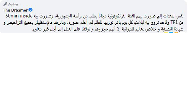 وقال في توضيح على صفحته على فيسبوك انه تم حجز نفس المعدات التي صور بها للقمة الفرنكوفونية مجاناُ بطلب من رئاسة الجمهورية، على حد قوله.