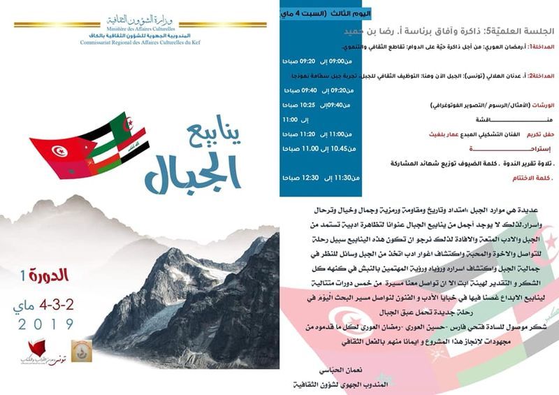 تزامنا مع احياء شهر التراث بالكاف تعيش مختلف دور الثقافة بولاية الكاف على وقع جملة من الأحداث والفعاليات الثقافية التي من ضمنها تظاهرة "ينابيع الجبال" التي افتتحت اليوم وتتواصل إلى غية يوم السبت 4 ماي الحالي.
