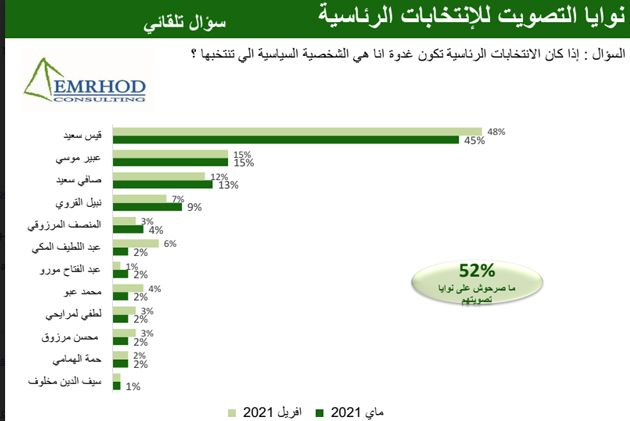 وجاءت رئيسة الحزب الدستوري الحر عبير موسي في المرتبة الثانية بـ 15 بالمائة ،ثم الصافي سعيد بـ 13 بالمائة ونيبل القروي بالمرتبة الرابعة بـ 9 بالمائة وفي المرتبة الخامسة المنصف المرزوقي بـ 4 بالمائة.