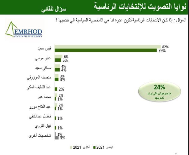 وقد تحصل سعيد على نسبة 79 بالمائة من نوايا التصويت، مقابل 82 بالمائة من النوايا في شهر أكتوبر الماضي.