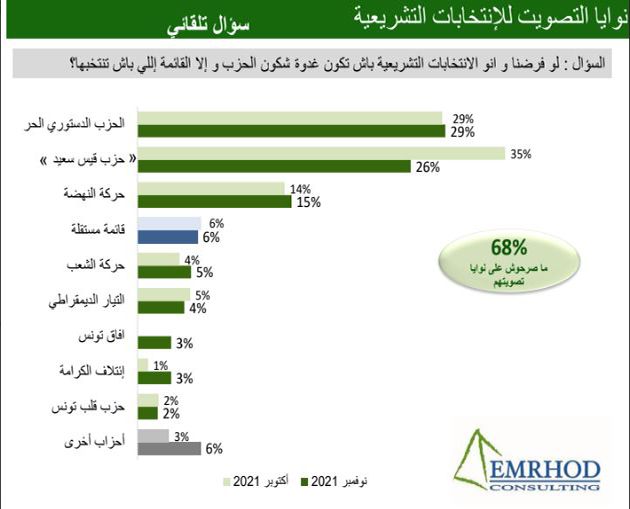 وتراجع حزب قيس سعيد إلى المرتبة الثانية بحصوله على 26 بالمائة من نوايا التصويت تليه حركة النهضة بنسبة 15 بالمائة.