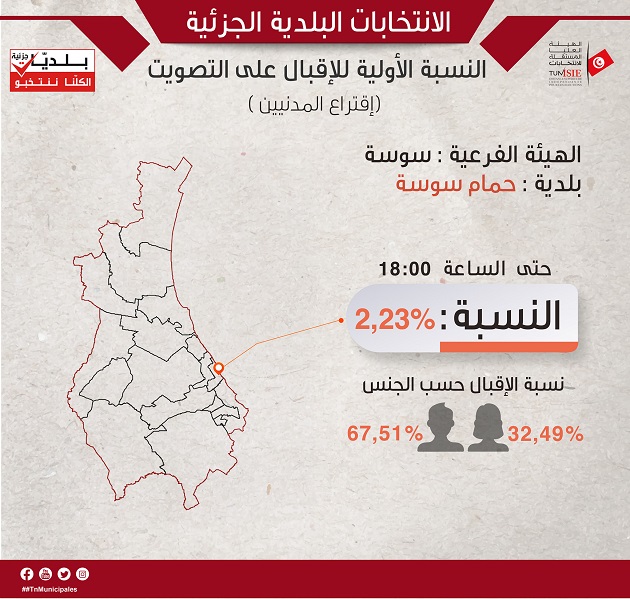 أفادت منسقة الإدارة الفرعية للانتخابات بسوسة عفاف جغام، في تصريح لـ "الجوهرة اف أم" بأن نسبة الاقبال على التصويت بالانتخابات البلدية الجزئية لبلدية حمام سوسة بلغت نسبة 2.23%.