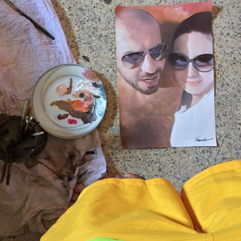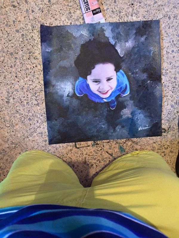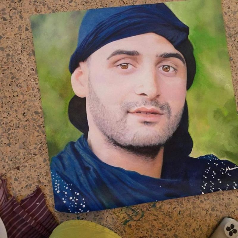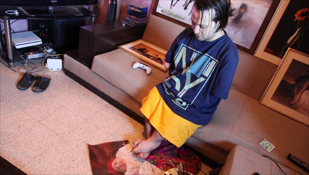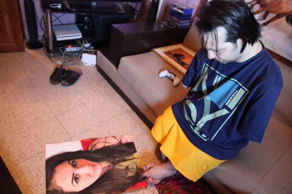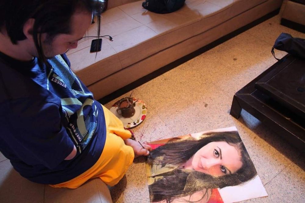 خلق من العجز إرادة، ليبدع لوحات فنّية رائعة.. فهو ليس بالرسام التشكيلي العادي لا سيما وأنه يثبّت بين أصابع قدمه ريشته ليمزج الألوان التي يحضّرها.. وبحركات خفيفة ينقل الريشة بين محمل الألوان ولوحته التي وضعها على الأرض ليسهّل عملية الرسم.