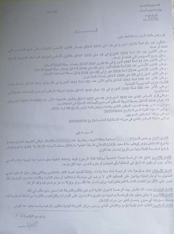 عبّرت المستشارة البلدية ورئيسة لجنة المرأة والأسرة بالمجلس البلدي بباردو زينب بن حسين، عن تفاجأ عدد من أعضاء المجلس البلدي بقرار رئيس البلدية الأحادي والقاضي بالموافقة على إشغال وقتي لرصيف أمام معهد خزندار لإنشاء مطعم خاص في شكل كُشك على مساحة 30 مترا² .