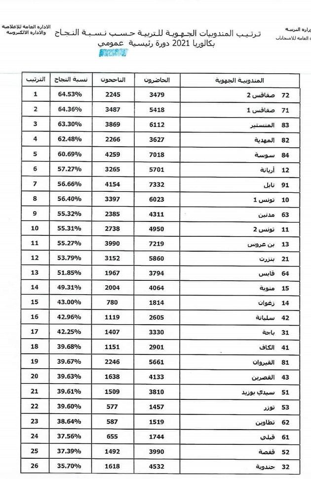 احتلت ولاية صفاقس الصدارة، من حيث نسب النجاح خلال الدورة الرئيسية باكالوريا 2021، حيث بلغت النسبة في المندوبية الجهوية للتربية صفاقس2، 64.53% وبلغت النسبة في المندوبية الجهوية صفاقس 1، 64.36%، فيما احتلت المندوبية الجهوية للتربية بالمنستير، المرتبة الثالثة 63.30%، تلتها المندوبية الجهوية للتربية بالمهدية بـ 62.48% وحلت المندوبية الجهوية للتربية المرتبة في المرتبة الخامسة بـ 60.69 %.