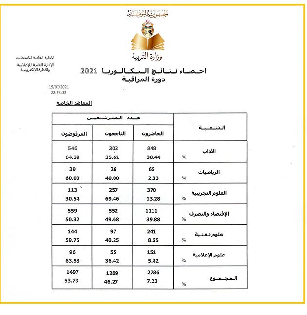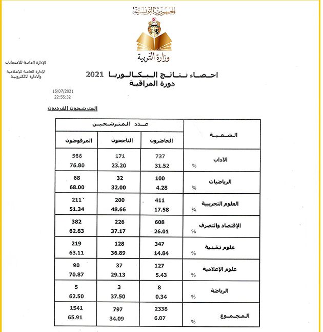 نشرت وزارة التربية صباح اليوم الجمعة 16 جويلية 2021 نتائج دورة المراقبة لامتحان بكالوريا 2021 ونسب النجاح حسب كل شعبة.