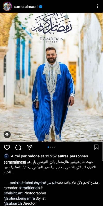 وكتب المصري تعليقًا جاء فيه: "حبيت طل عليكون هالرمضان بالزي التونسي يلي هو الأقرب إلى الزي الشامي .. حتى الياسمين التونسي بيذكرك دائما بياسمين الشام .. رمضان كريم وكل عام وأنتم بخير".