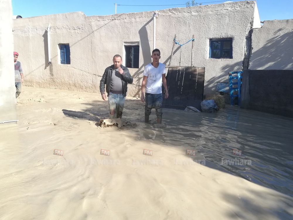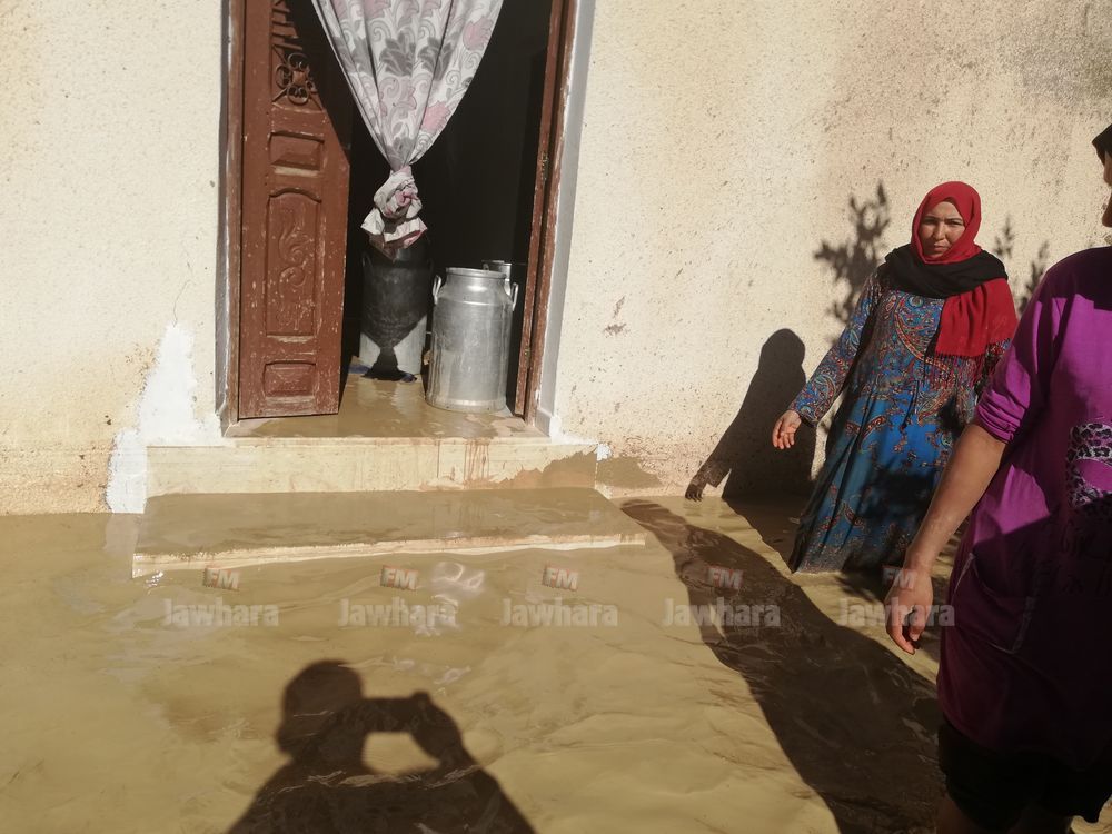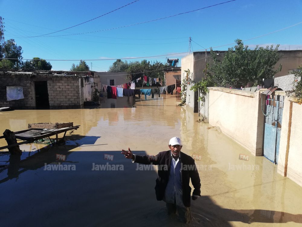 نقل مراسل "الجوهرة اف أم، رفيق العيادي، بالصور الأحياء التي غمرتها المياه بمنطقة الطراخنة من ولاية جندوبة جراء فيضان وادي تاسة.