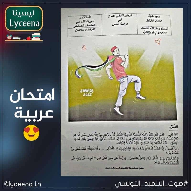 واهتمّ موضوع احد نصوص الامتحانات بالحركة الرمزية التي بادر بها الشاب التونسي أمين بالآغا للتذكير بالقضية الفلسطينية في بعدها الانساني.