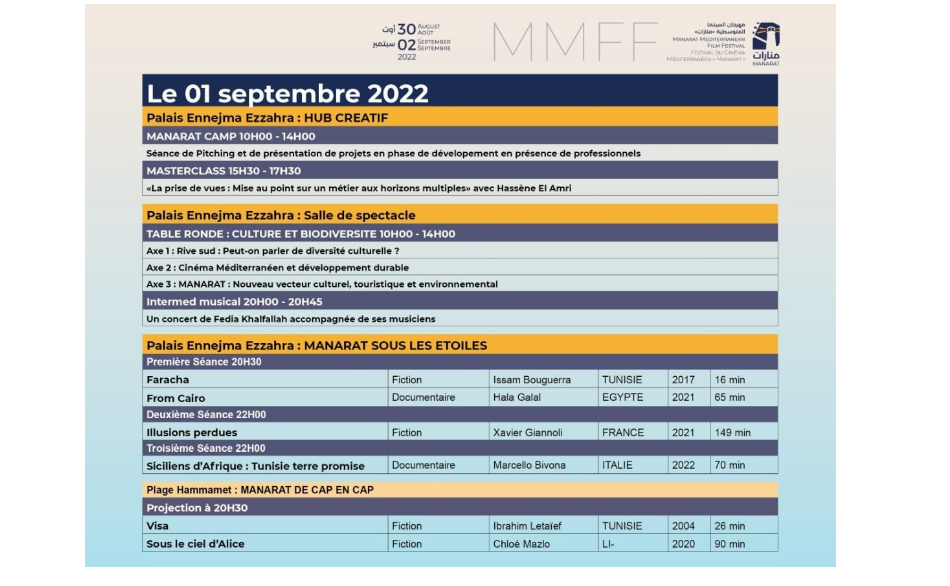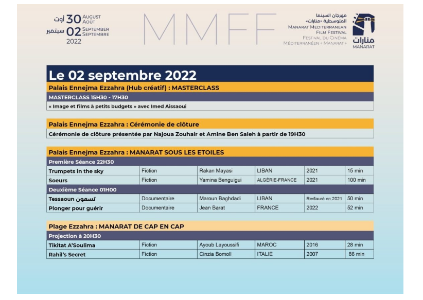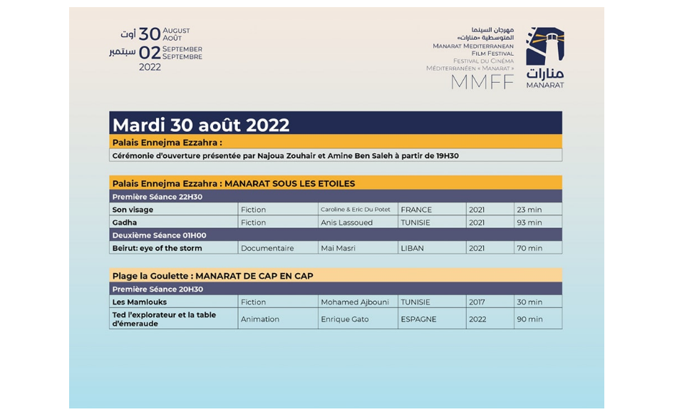 تُنظم بداية من اليوم الثلاثاء 30 أوت 2022، فعاليات الدورة الثالثة لمهرجان السينما المتوسطية "منارات" لتتواصل إلى غاية يوم الجمعة 2 سبتمبر القادم.