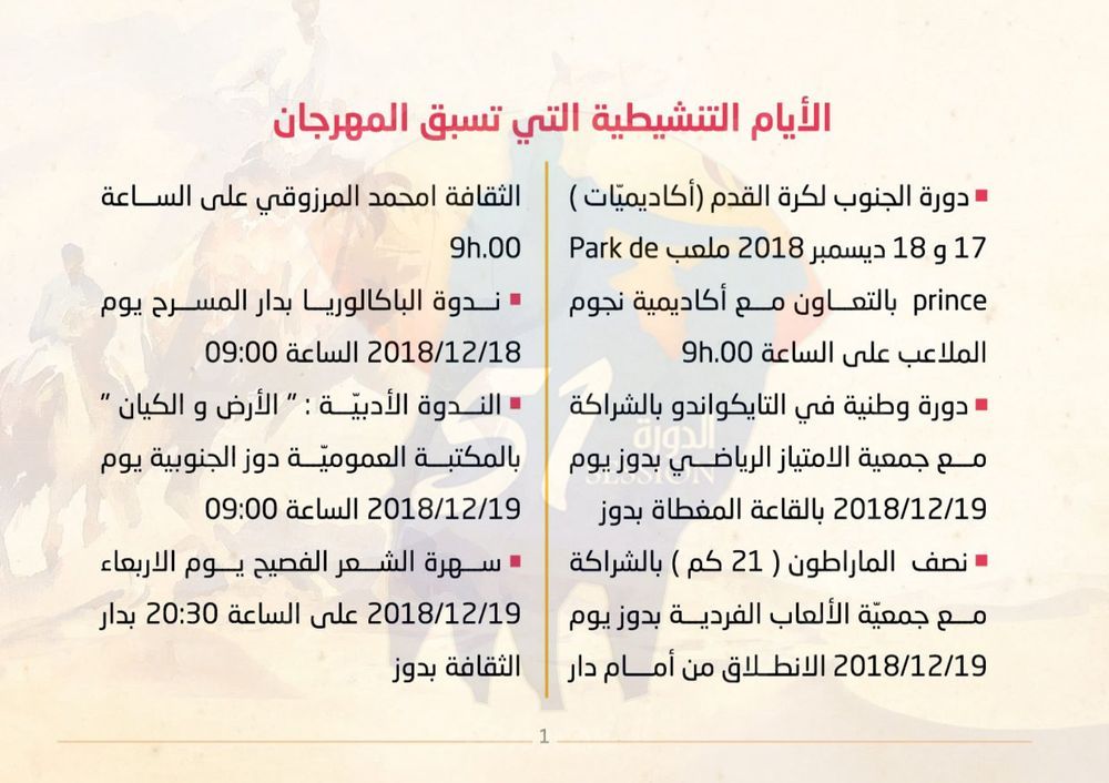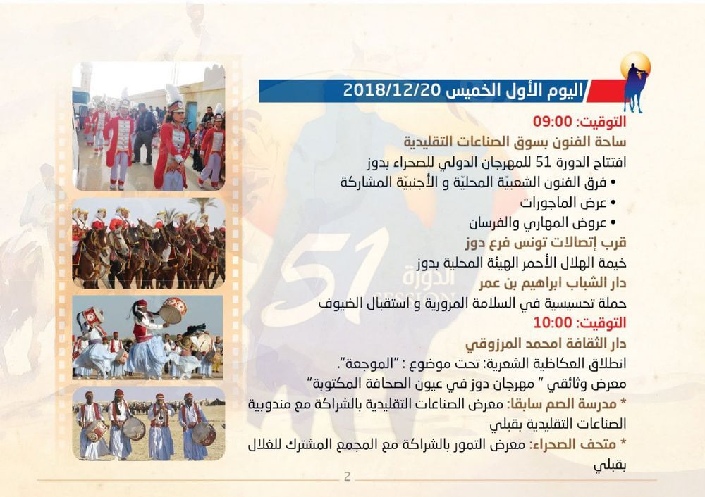 تفتتح اليوم فعاليات الدورة 51 من المهرجان الدولي للصحراء بدوز وتتواصل إلى غاية يوم 23 ديسمبر 2018 تحت شعار "عبق التراث وروح الأصالة".