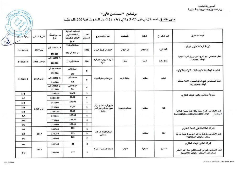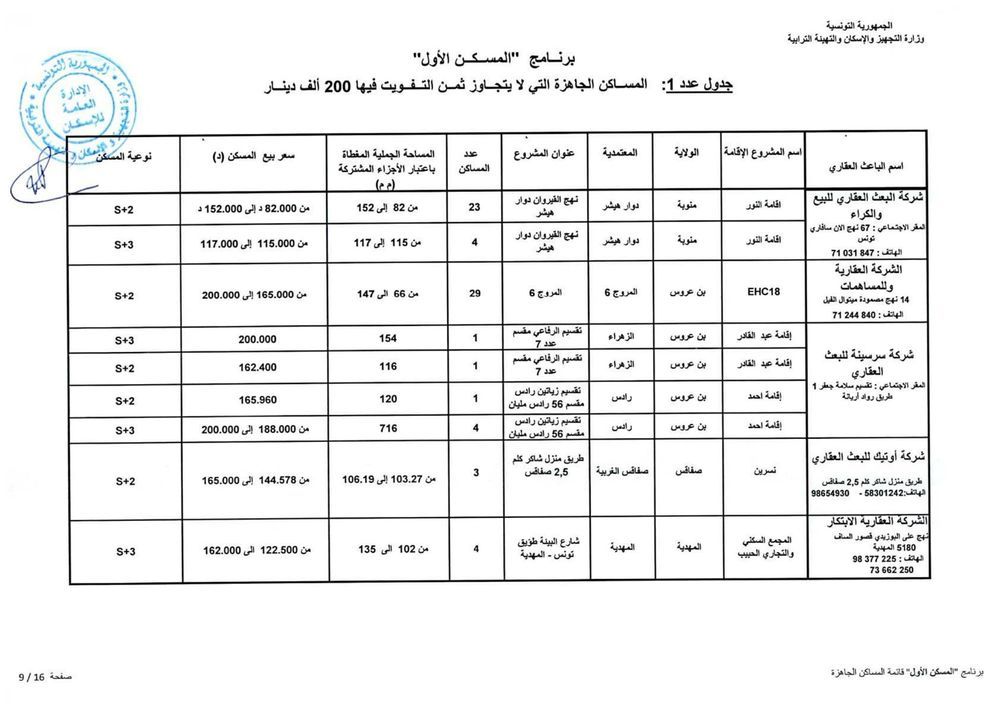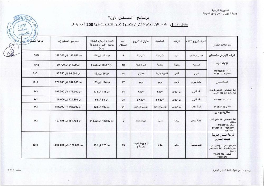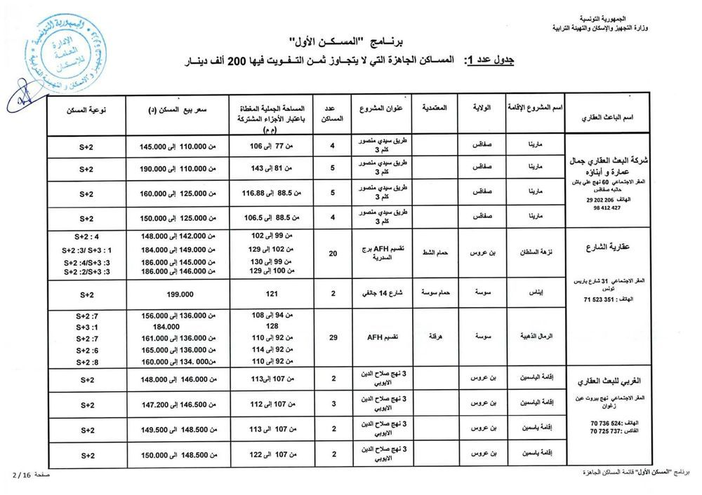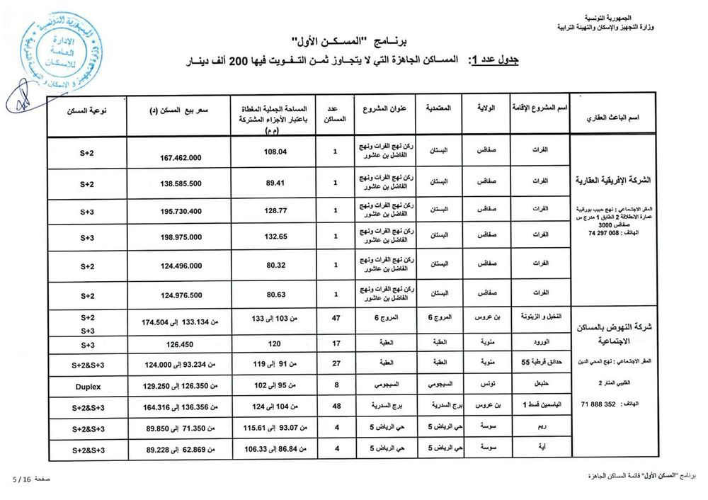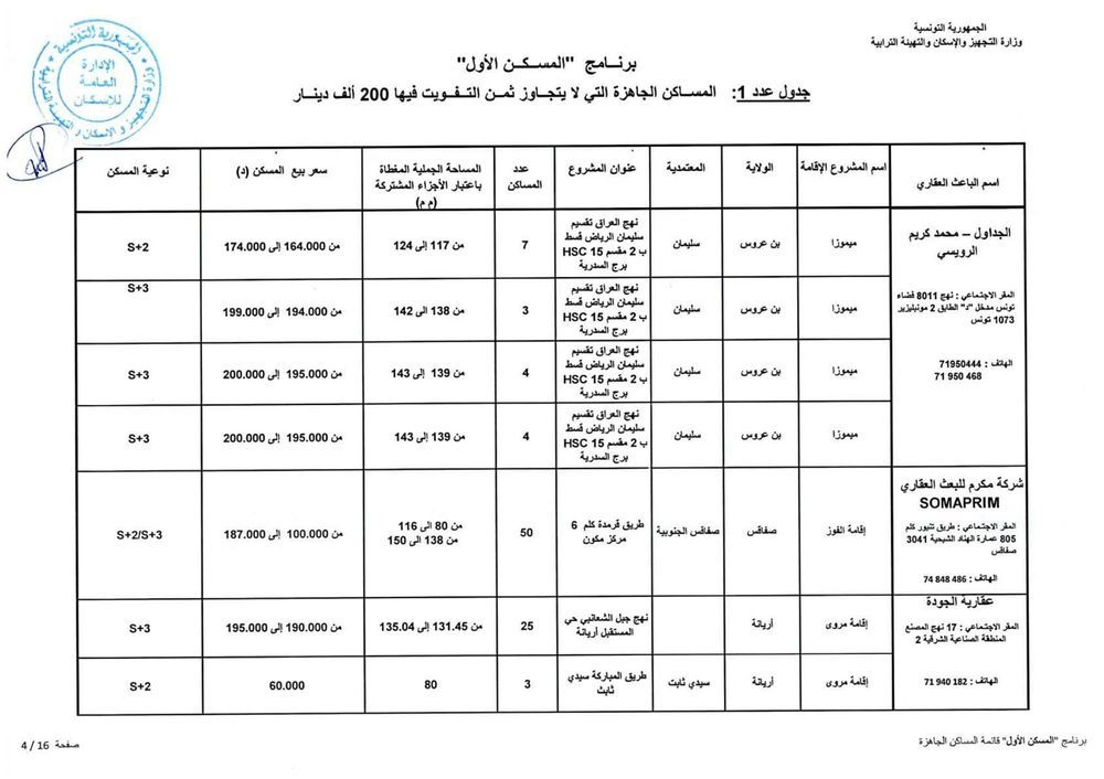 وحسب رئيس الغرفة النقابية للباعثين العقاريين بالبلاد التونسية، فهمي شعبان، هناك حوالي 1012 مسكنا جاهزا موزعا على 15 جهة موضوعا على ذمة البرنامج باسعار تتراوح حسب المناطق، بين 110 الف دينار و200 الف دينار. وتضم هذه المساكن على الاقل قاعة جلوس وغرفتين يقع التفويت فيها لفائدة المنتفعين بعد امضاء وثيقة حجز (بين الباعث العقاري والحريف) في اجل اقصاه 45 يوما.